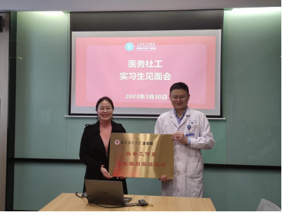 省人民医院社工部全体带教老师为宝马会官网 大四学生的毕业实习提供专业指导与系统培训,许芸主任对此深表感谢。随后,许芸主任与赵沛主任共同为社会工作专业实习实践基地揭牌。