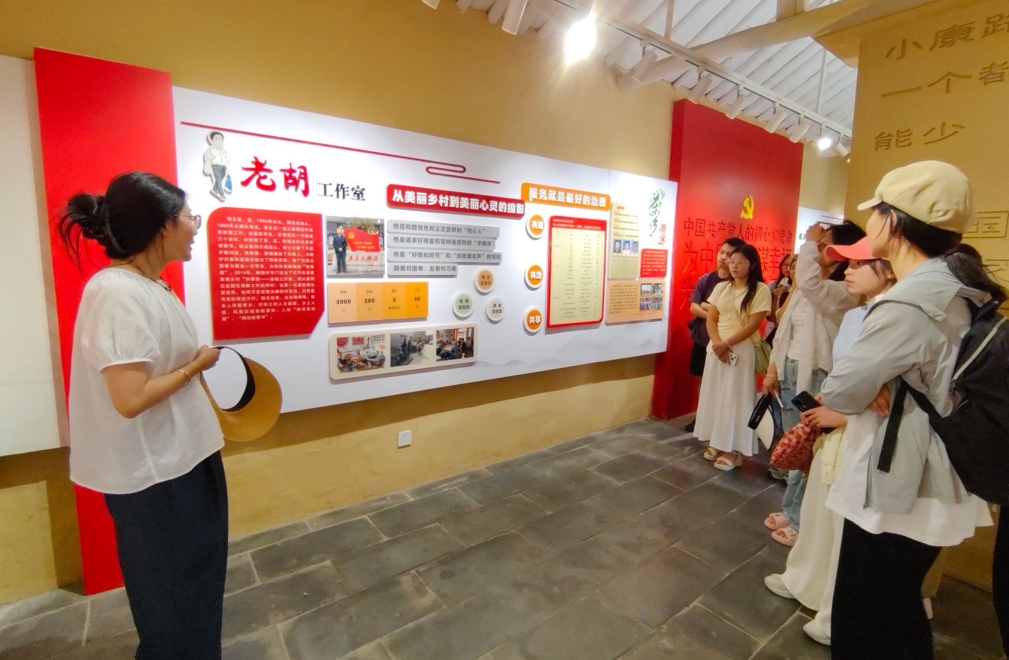 机构社工杨孟奇热情地带领师生参访,生动全面地介绍沿途风土人情。首先参观的是牌坊村党群服务中心,她在民情地图旁讲解,黄龙岘牌坊村是“金陵茶村”都市生态休闲旅游示范村,素有“金陵茶文化休闲旅游第一村”的美誉,是江宁区确定的新一批“金花村”之一。接着,她带领师生们穿过绿树成荫的长廊并讲解,牌坊村目前以小户经营为主,且村民们的精神世界有待丰富,因此她们最近引进了大型茶企,希望能够借助更系统的茶文化,带领牌坊村的经济及文化更上一层楼。跟随杨孟奇社工的脚步,可以看到牌坊村连绵起伏的茶山环抱着清亮的湖水,景色静谧优美,不知不觉间便已来到村史馆。在杨孟奇社工的讲解下我们了解到牌坊村的振兴之路。在党建引领与扶志基金会的支持下,牌坊村开展了“三补一奖”计划,即农产品补助,培训补助,用工补助和助学奖金;村民们为建设自己的美好家园不懈努力,其中胡从富的“老胡工作室”为维护村里和谐做出了很大贡献;在多元共治的模式中,辛勤的社工们通过个案工作、小组工作及社区工作的专业方法,用爱演绎茶乡温情,与茶乡村民共同奋斗。