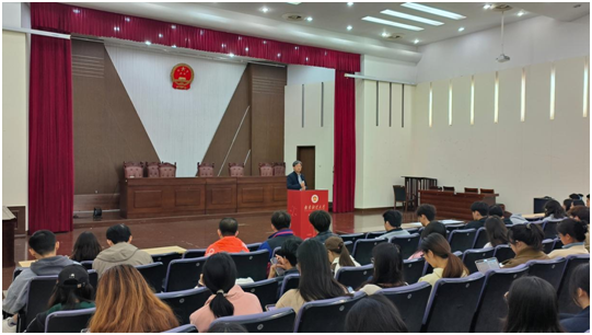 11月7日中午,宝马会官网 党委书记黄建国在德正楼二楼模拟法庭给党的发展对象讲授“学习党的二十届三中全会中的法治元素”主题党课。