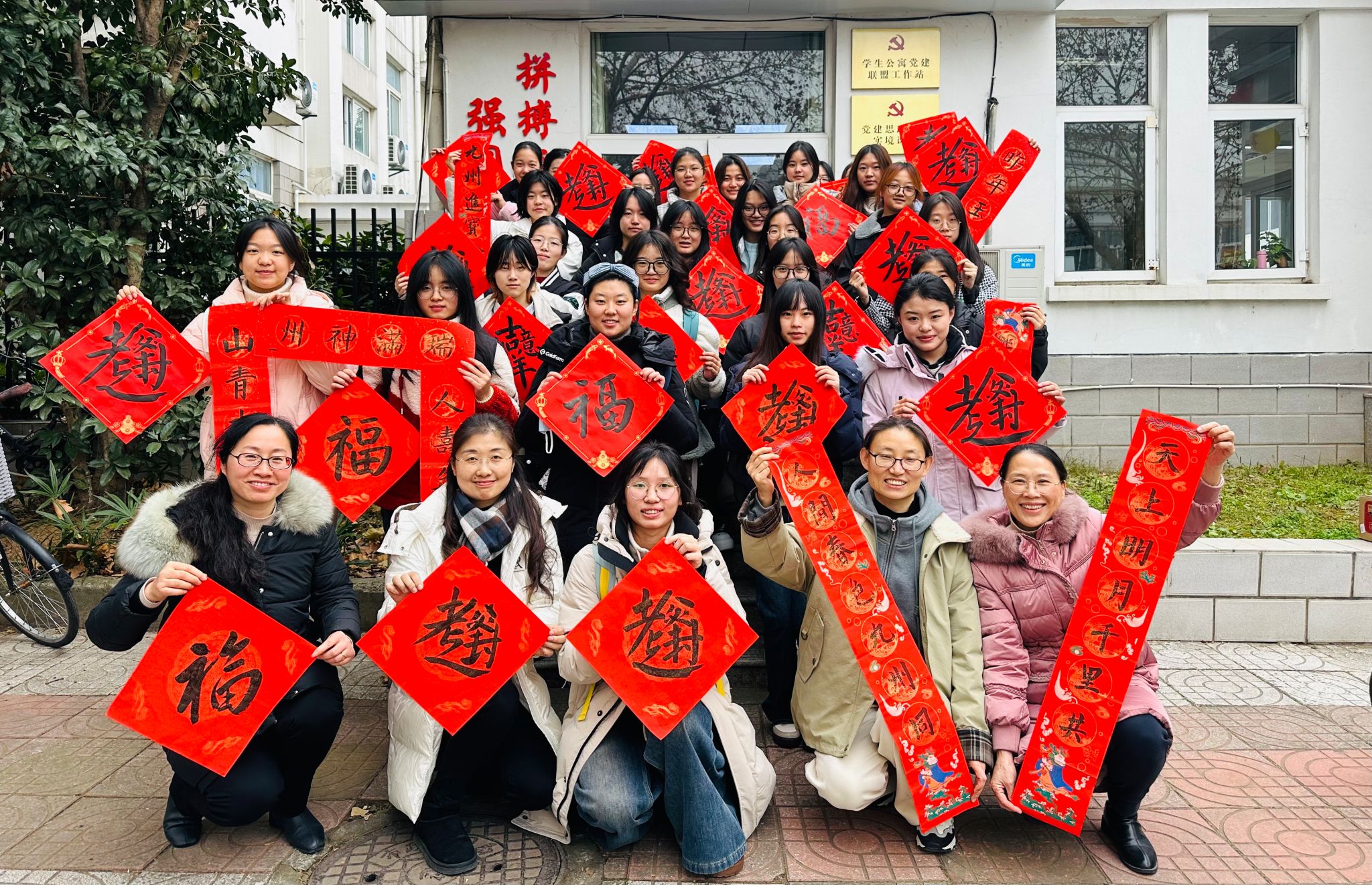 12月25日中午,宝马会官网 组织党员教师在仙林校区北苑“一站式”学生社区服务中心举行“走进公寓,送‘福’到家”活动。院党委副书记刘英华,党员教师龚月红、王丽君、康兰媛以及对接的宿舍同学一起参加了活动。