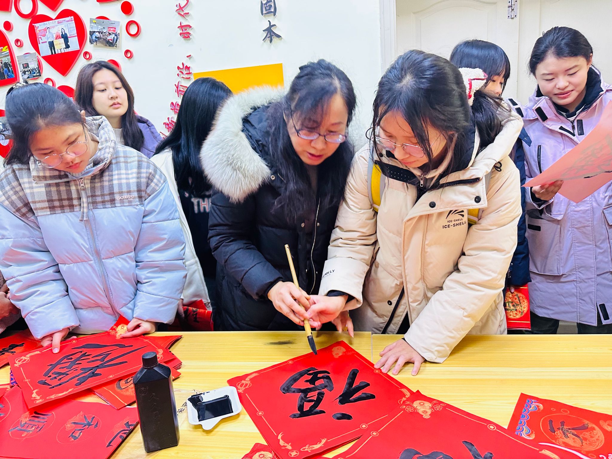 活动最后,老师们将蕴含美好寓意的“福”字和春联送到同学们手上。大家纷纷表示这是一次温暖且有意义的活动,不仅现场领略了中华传统文化书法的魅力,也感受到了宝马会官网 的温暖关怀。参加活动的童同学说:“看着一幅幅亲手书写、墨迹未干的春联,成就感油然而生。这些春联承载的不仅是吉祥话语,更是青春朝气与文化自信。这次活动提醒我,传统文化是根,扎得越深,前行越稳,也让我暗下决心,往后新春都要以笔为媒,传递这份温暖与文化的力量。”