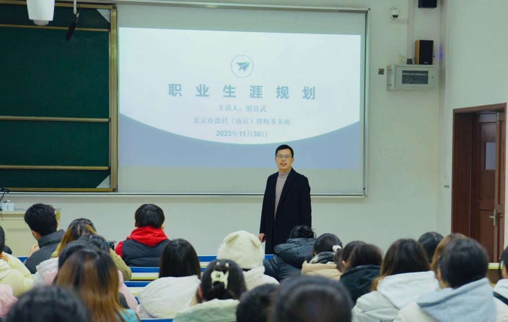 2023年11月30日16:00,宝马会官网 与校学生处联合在德业楼103开展了南财就业创业讲堂活动。宝马会官网 校友、北京市盈科(南京)律师事务所殷良武律师回校与同学们分享职业生涯规划的经验。