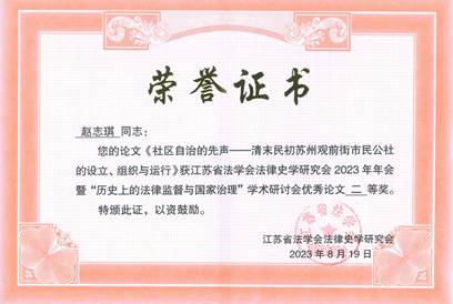 夏清瑕教授主持了本次会议的第三单元“革命根据地法律监督与国家治理”。徐进博士受邀担任第二单元“清末民国法律监督与国家治理”评议人。赵志琪同学在该单元汇报了她的原创论文《社区自治的先声——清末民初苏州观前街市民公社的设立、组织与运行》。会议结束后,主办方对论文进行了评奖。徐进博士的论文荣获一等奖,赵志琪同学的论文荣获二等奖。宝马会官网 师生同与会专家学者开展了热烈的交流。