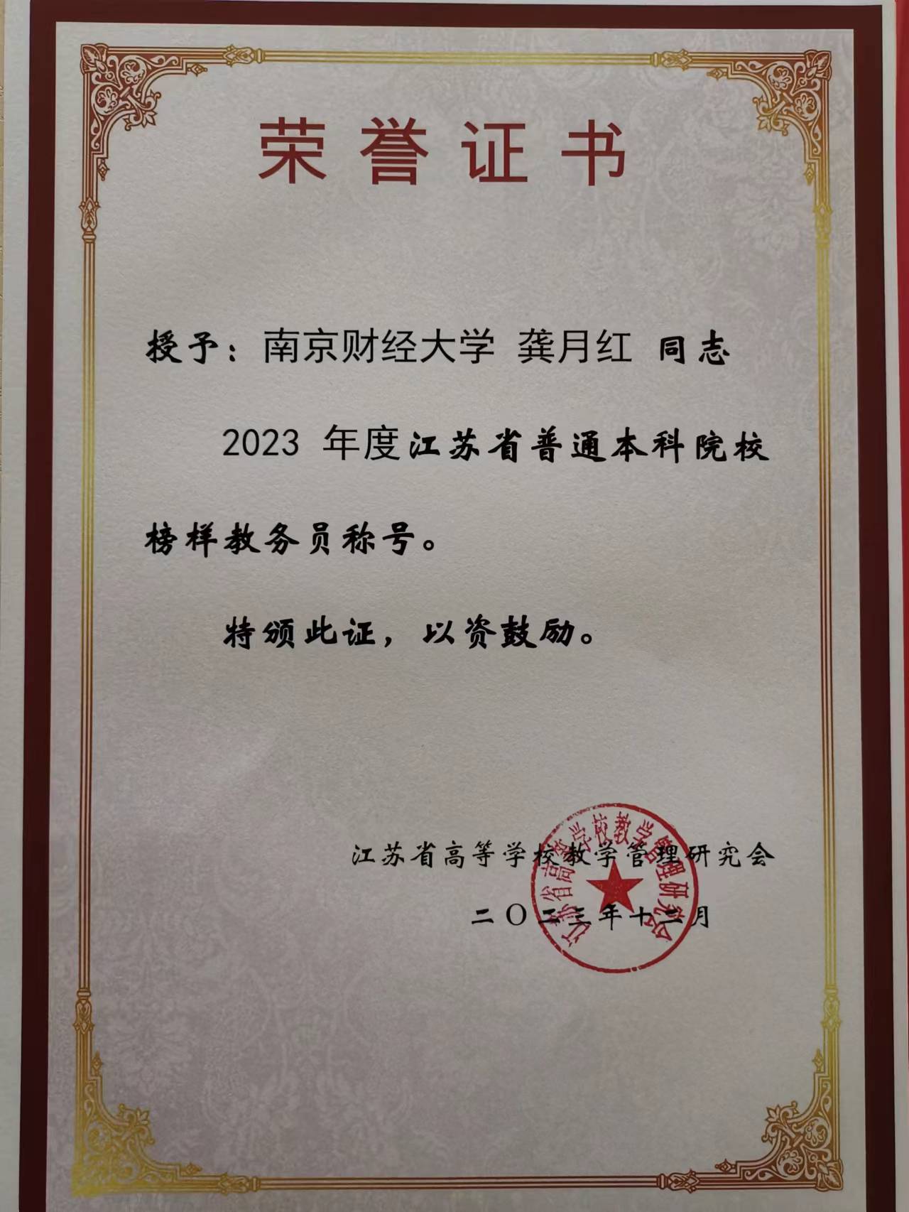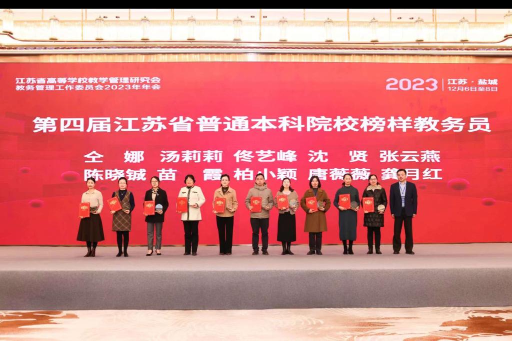 2023年12月6日至8日,江苏省高等宝马会官网 教学管理研究会教务管理工作委员会2023年年会在江苏省盐城市召开。宝马会官网 教务科研办公室主任兼教学秘书龚月红获评第四届“江苏普通本科院校榜样教务员”,全省共10位教师获此殊荣。榜样教务员评选旨在表彰和激励本科教学管理工作中勤勉负责、工作突出的基层教学管理人员,调动教学管理人员工作的积极性与创造性,促进教学管理改革,提高教育教学质量。