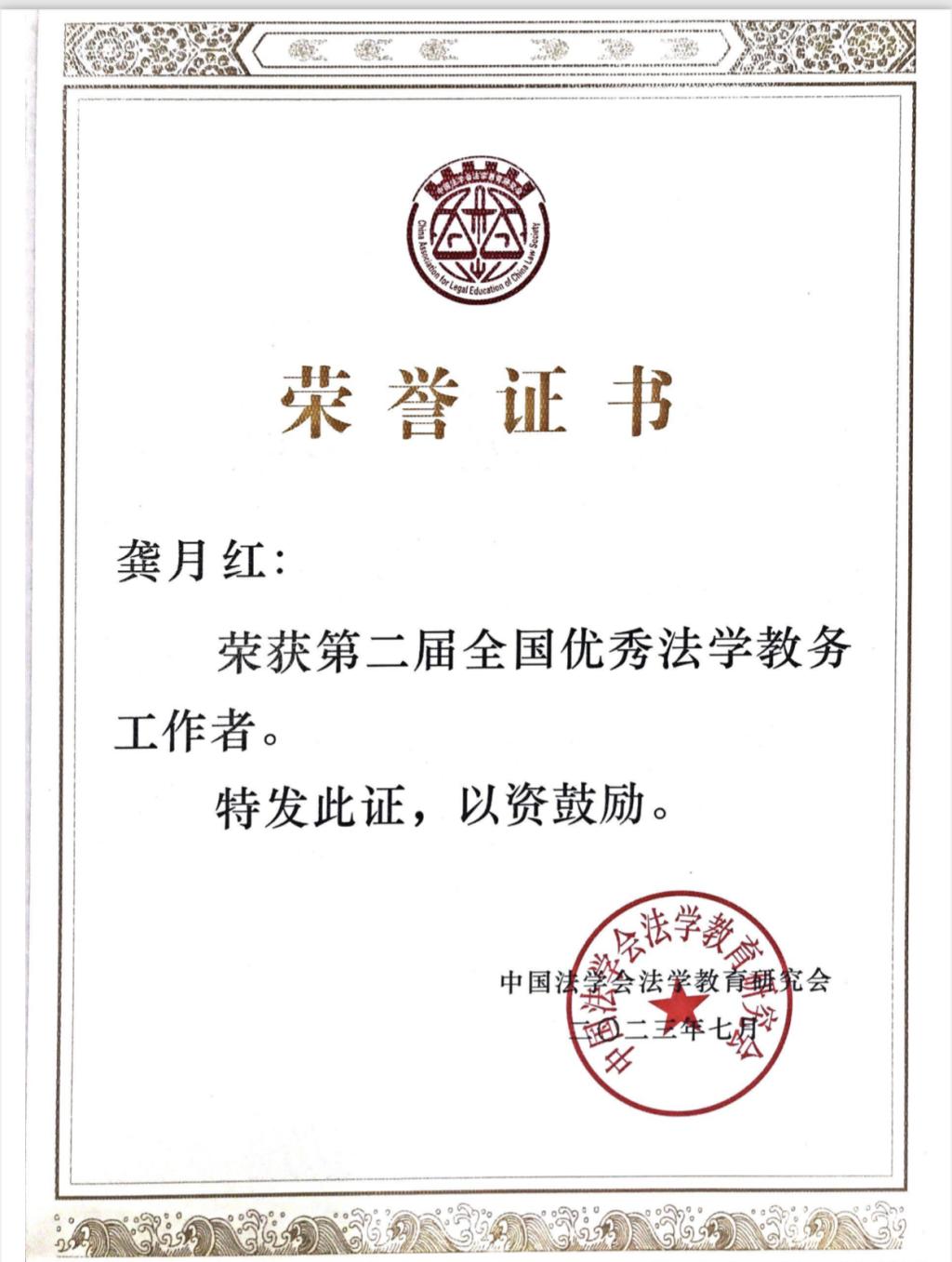 宝马会官网 龚月红老师获评中国法学会法学教育研究会第二届“全国优秀法学教务工作者”