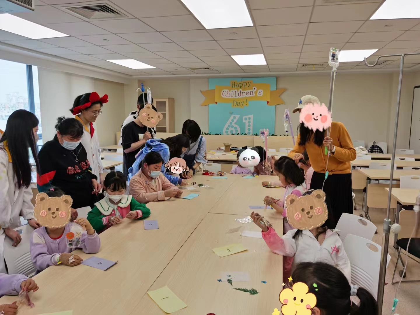 在儿科三病区,共有11对患儿及家属参与此次活动。活动伊始,医务社工通过卡通视频让小朋友们了解世界读书日的由来。随后,医务社工带领患儿进行《爱读书》手指操的热身活动,让活动现场变得更加欢快,小朋友与医务社工互帮互助,共同学习。医务社工与同学们共同合作,将格雷涅茨画作的《彩虹色的花》绘本改编成话剧演出,绘声绘色地将绘本展现在小朋友的面前,赢得了大家的欢呼声和赞美声。小朋友们还在表演结束后和穿着玩偶服的志愿者们进行热情互动,向志愿者哥哥姐姐们表达了自己的喜爱;在制作书签的活动中,当志愿者发现有的小朋友因为正在打吊针不方便制作书签时,都主动前去帮助他们解决困难,或是帮助他们扶着挂吊针的杆子,或是帮助他们一起完成书签的制作,整个示演厅都充满了温暖和谐的氛围。通过这样的活动,同学们在服务中体会到了助人精神和快乐意义,并且将课本知识带进了实践中,提升了专业认同。
