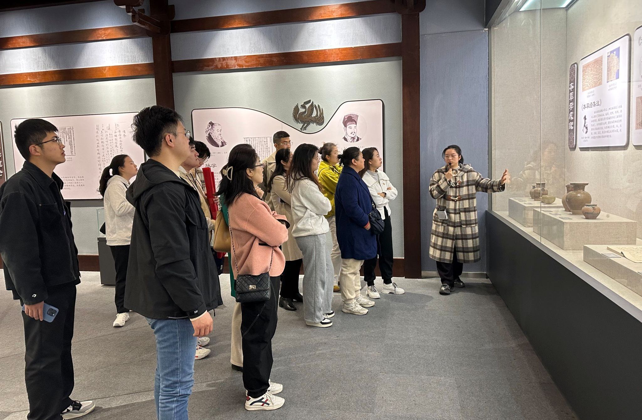 在江苏省中医药博物馆专业讲解团队的引导下,师生参观了中国医史馆、江苏中医馆、中药馆和养生文化馆四个常设展厅。讲解员依托馆藏标本及文献,重点阐释了中医药“阴阳调和”“辨证施治”等核心理论,并还原了中医药在防疫、养生等领域的实践智慧。在互动体验环节,讲解员结合针灸铜人模型,现场演示了合谷穴、足三里、内关穴等穴位疗法,科学解析了经络学说与现代医学的协同关系,师生通过实践操作直观感受中医药文化的实用价值。