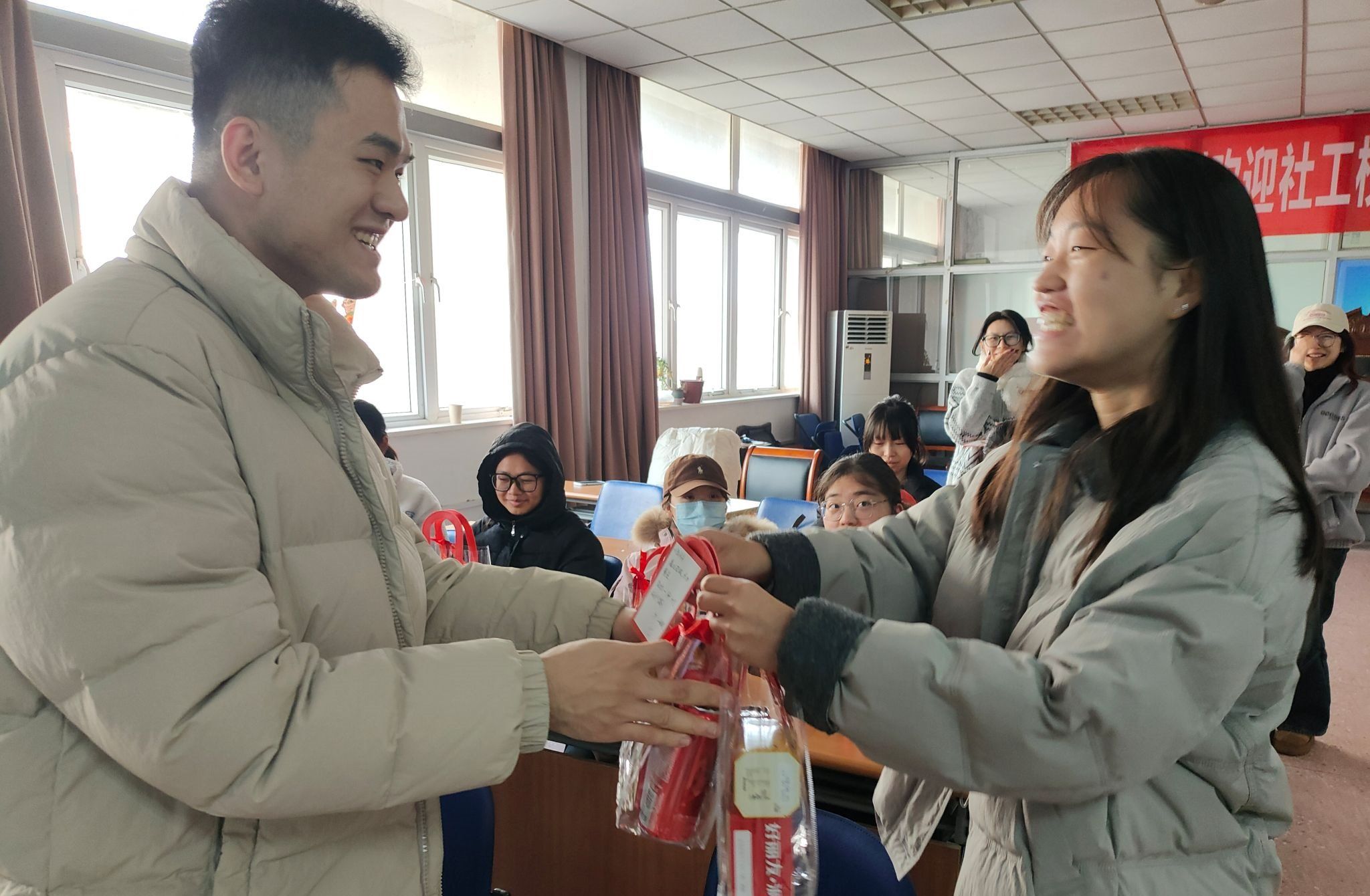 宝马会官网 社会工作系大三全体同学在社工系许芸主任、张亮亮老师的指导下,在班委的牵头下,精心筹备并送上饱含心意的“考研加油包”,用满满的心意为研途追梦人吹响冲刺号角。12月11日,考研倒计时的关键节点,社工大三的同学们将这份满载心意的加油包逐一送到考研学长学姐手中。金榜题名福袋,将美好祝愿具象化;金榜题名定制可乐、薯愿薯片、好丽友派为备考补充能量,同时也寓意着“乐成愿遂,派运上岸”;小小的“考研加油包”里,藏着满满的巧思与祝福。寓意“前程锦绣”的金榜题名福袋,将抽象的期盼化为触手可及的温暖;印着“一战成硕”“金榜题名”的定制可乐、香酥的薯愿薯片、绵软的好丽友派,不仅为高强度备考补充能量,更藏着“乐成愿遂,派运上岸”的美好谐音;励志挂件更希望能为学长学姐的冲刺时光增添一抹趣味与动力。