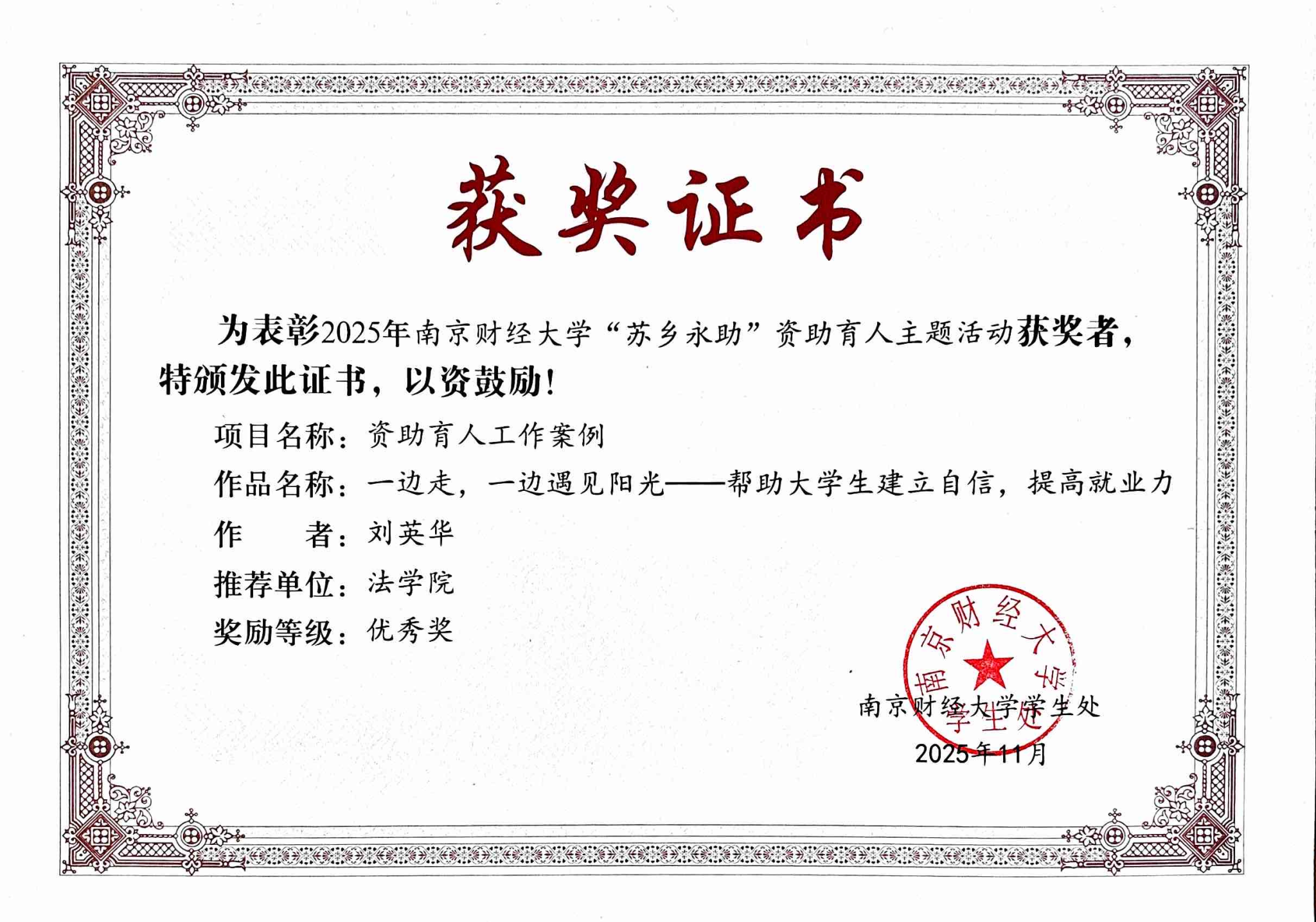 近日,2025年宝马会官网 “苏乡永助”资助育人主题活动评选结果揭晓。宝马会官网 党委副书记刘英华老师的资助育人工作案例《一边走,一边遇见阳光——帮助大学生建立自信,提高就业力》荣获优秀奖,充分展现了宝马会官网 在资助育人工作中的扎实成效与创新实践。