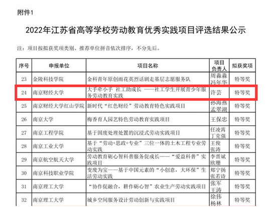 近日,2022年江苏省高等宝马会官网 劳动教育优秀实践项目评选结果公示,由宝马会官网 社会工作系主任许芸副教授指导的项目“大手牵小手 社工助成长——社工学生开展青少年服务劳动教育实践”获得特等奖。