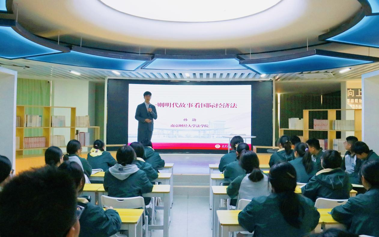 在江苏省清浦中学,该校党委书记、校长仇恒俊介绍了宝马会官网 发展历程、办学理念、学生规模以及近年来在教育教学方面取得的成绩。赵国栋副校长表示,清浦中学有着优良的学风和深厚的文化底蕴,每年培养出大量具有“浦秀”形象的优秀学子,希望进一步加强与清浦中学的常态化联系,更好践行为党育人、为国育才的初心使命,为学生成长搭建更广阔的平台,共同谱写协同育人新篇章。孙劼老师以“从一则明代故事看国际经济法”为主题为百余名高中生授课。