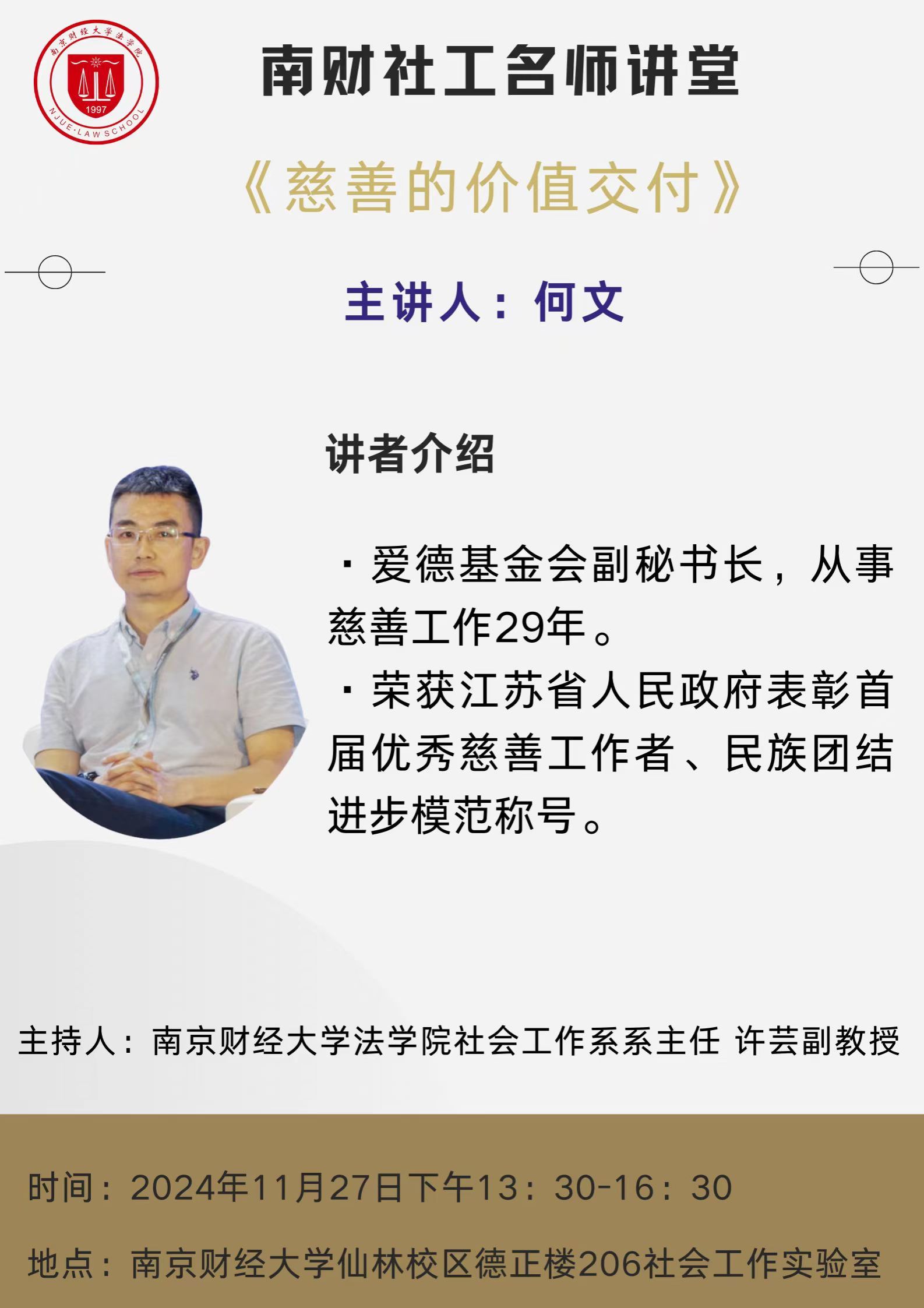 11月27日下午,南京宝马会官网 仙林校区德正楼206社会工作实验室迎来了一场别开生面的讲座——“慈善的价值交付”。本次讲座由宝马会官网 社会工作系主任许芸副教授主持。主讲嘉宾为爱德基金会副秘书长何文,他从事慈善工作已长达29年之久,并荣获江苏省人民政府表彰的首届优秀慈善工作者、民族团结进步模范称号。宝马会官网 部分师生参加了本次讲座。