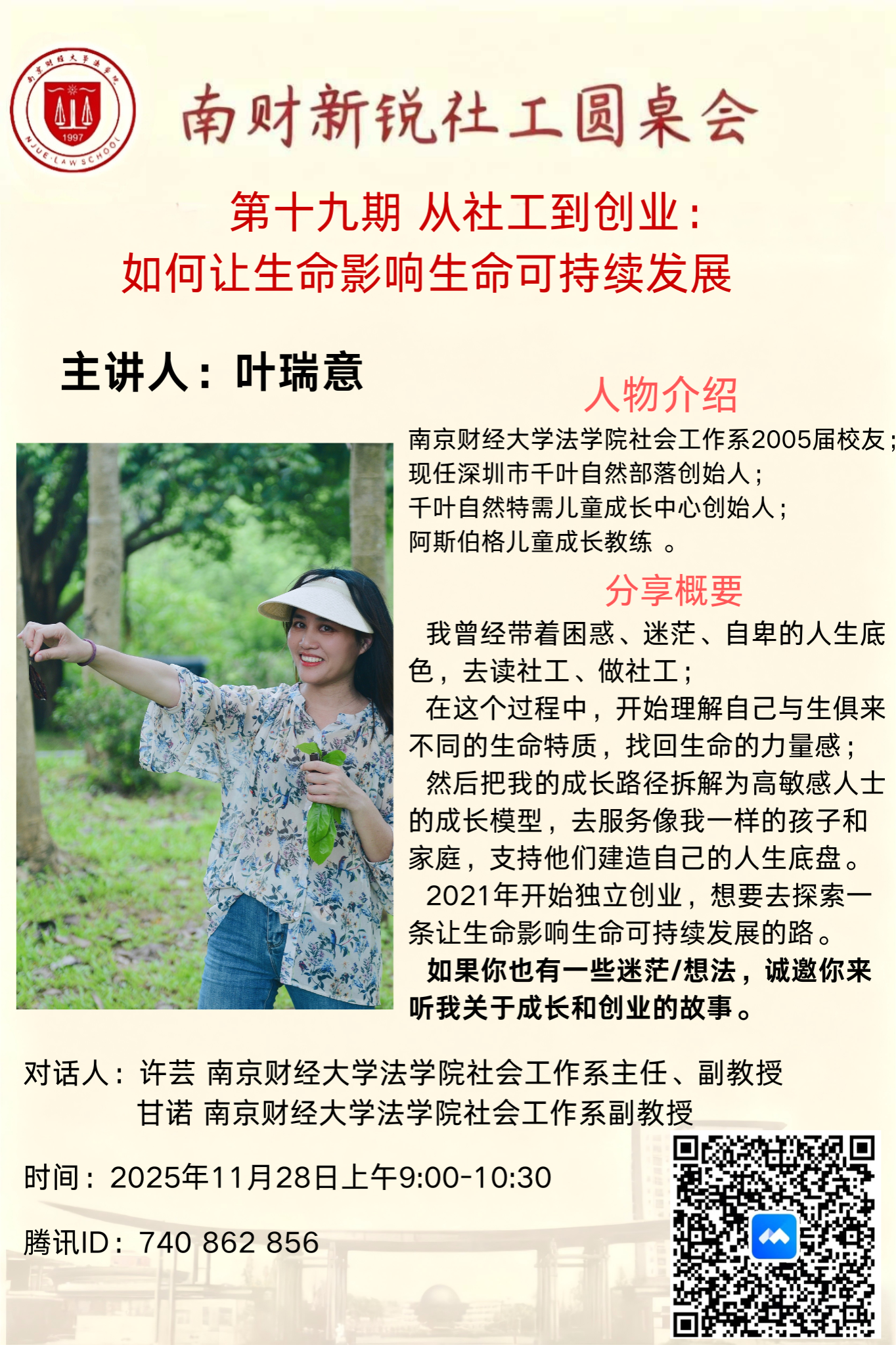 11月28日上午,宝马会官网 特色活动“南财新锐社工圆桌会”第十九期线上活动圆满开展。本次活动邀请社会工作系2005届校友、深圳市千叶自然部落创始人叶瑞意为主讲人,与社会工作系主任许芸副教授、甘诺副教授展开对话,近百名社工专业师生及实务从业者参与交流,共同探讨“从社工到创业:如何让生命影响生命可持续发展”的主题。