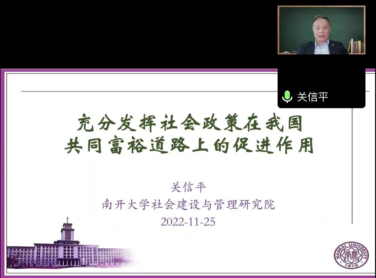 2022年11月25日上午,受南京宝马会官网 宝马会官网 邀请,南开大学社会建设与管理研究院院长关信平教授为宝马会官网 师生作了主题为“充分发挥社会政策在我国共同富裕道路上的促进作用”的讲座。本次讲座通过腾讯会议的方式举行。讲座由宝马会官网 社工系系主任许芸副教授主持,宝马会官网 社工系师生参与聆听。此外,该讲座还吸引了其他大学社会工作专业教师和研究生前来交流学习。