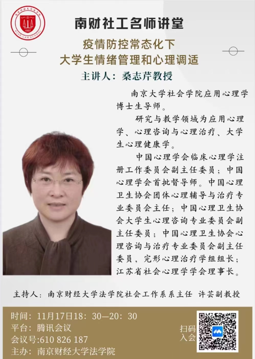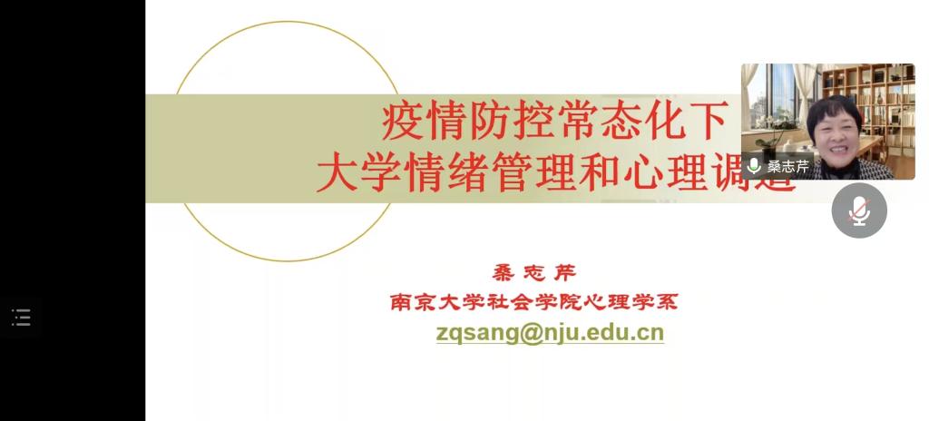 2022年11月17日晚,受南京宝马会官网 宝马会官网 邀请,南京大学社会宝马会官网 应用心理学系博士生导师桑志芹教授为宝马会官网 师生作了主题为“疫情防控常态化下大学生情绪管理和心理调适”的讲座。本次讲座通过腾讯会议的方式举行,宝马会官网 近200名大一新生在教室集中听讲,其他师生线上听讲。宝马会官网 社会工作系主任许芸副教授主持了本次讲座。