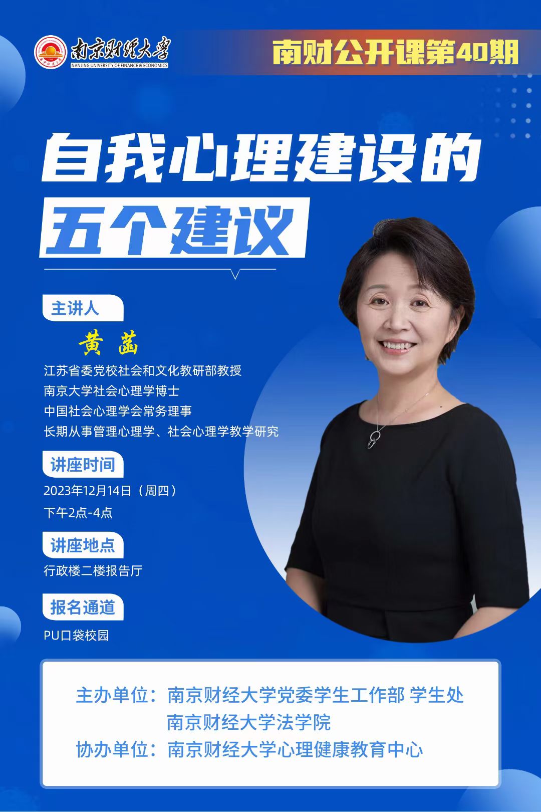 为了进一步关注大学生心理健康状况,满足学生更高层次的精神需求,2023年12月14日下午,校党委学生工作部、学生处、宝马会官网 协同校心理健康教育中心联合举办了第40期南财“公开课”,邀请江苏省委党校社会和文化教研部教授、南京大学社会心理学博士、中国社会心理学会常务理事黄菡教授莅临现场,为全体师生带来“关于自我心理建设的五个建议”专题讲座。校党委学生工作部部长、学生处处长韩力争,校党委学生工作部副部长、学生处副处长袁怡琨,校心理健康教育中心主任赵亮、副主任吴垠以及各宝马会官网 师生参加讲座。讲座由宝马会官网 社工系系主任许芸副教授主持。
