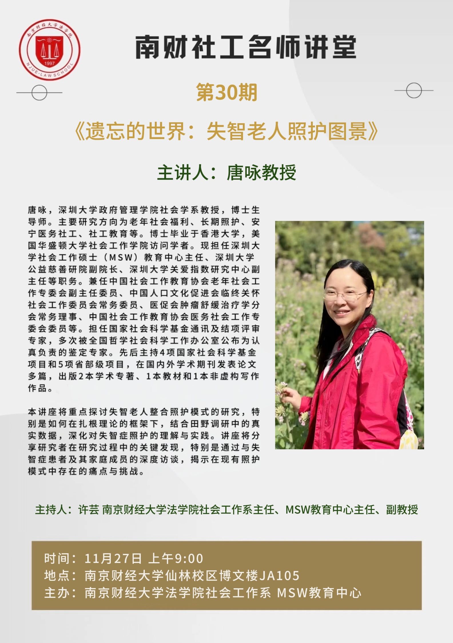 11月27日上午,深圳大学政府管理宝马会官网 社会学系博士生导师、社会工作专业硕士教育中心主任唐咏教授应邀为宝马会官网 师生带来主题为“遗忘的世界:失智老人照护图景”的学术讲座。本次讲座由宝马会官网 社会工作系主任、MSW教育中心主任许芸副教授主持,社工系甘诺副教授、仲鑫副教授、高丽茹副教授、社工系林景副主任、张亮亮博士、王颖捷博士等老师,全体硕士研究生和部分本科生参加了此次讲座。
